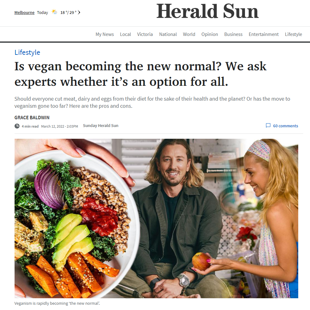The article “Is vegan the new normal?” was published on the Herald Sun website, linked here. The online version is only accessible to Herald Sun subscribers, but a PDF version of the article can be found here.